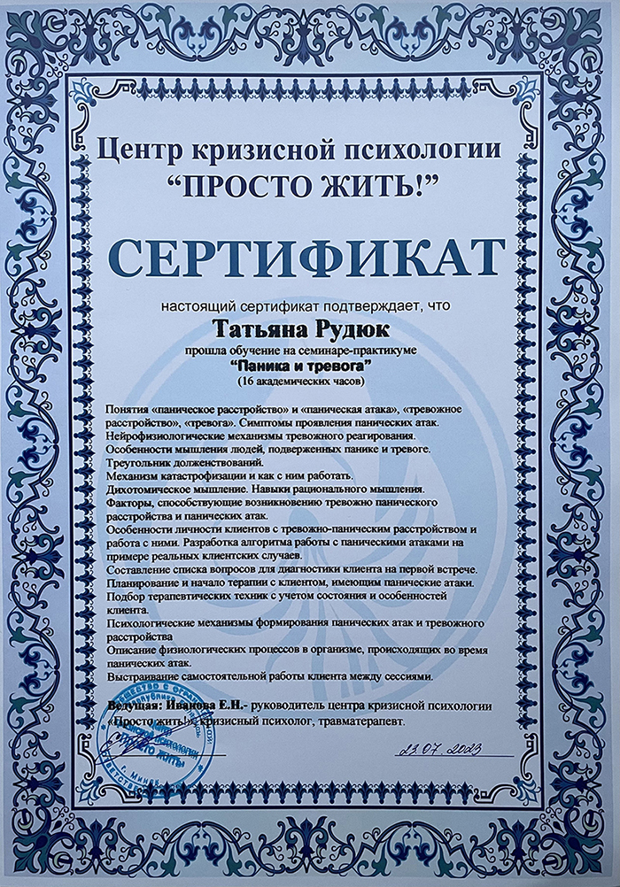 • 2023 г. — тренинг «Тревога и паника»;