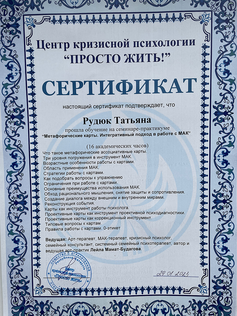 • 2023 г. — тренинг «Метафорические карты. Интегративный подход в работе с МАК»;