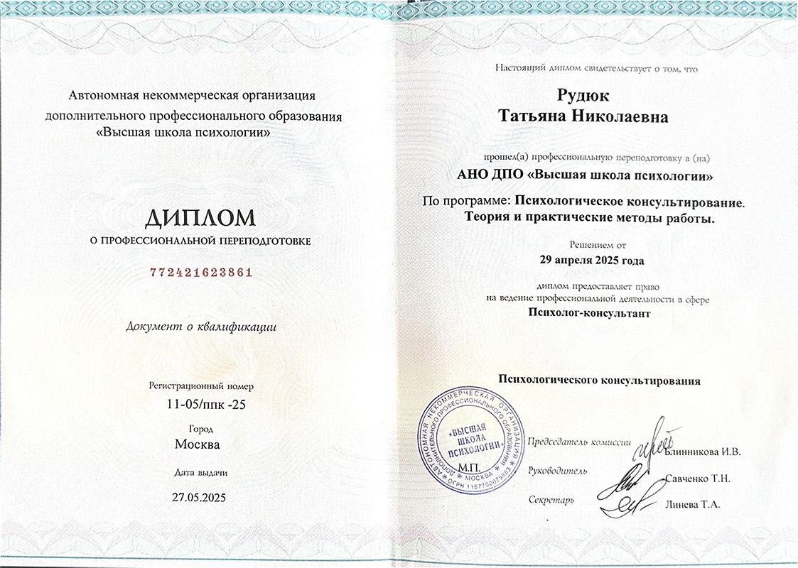 • 2024–2025 гг. — профессиональная переподготовка «Психолог-консультант», Москва;