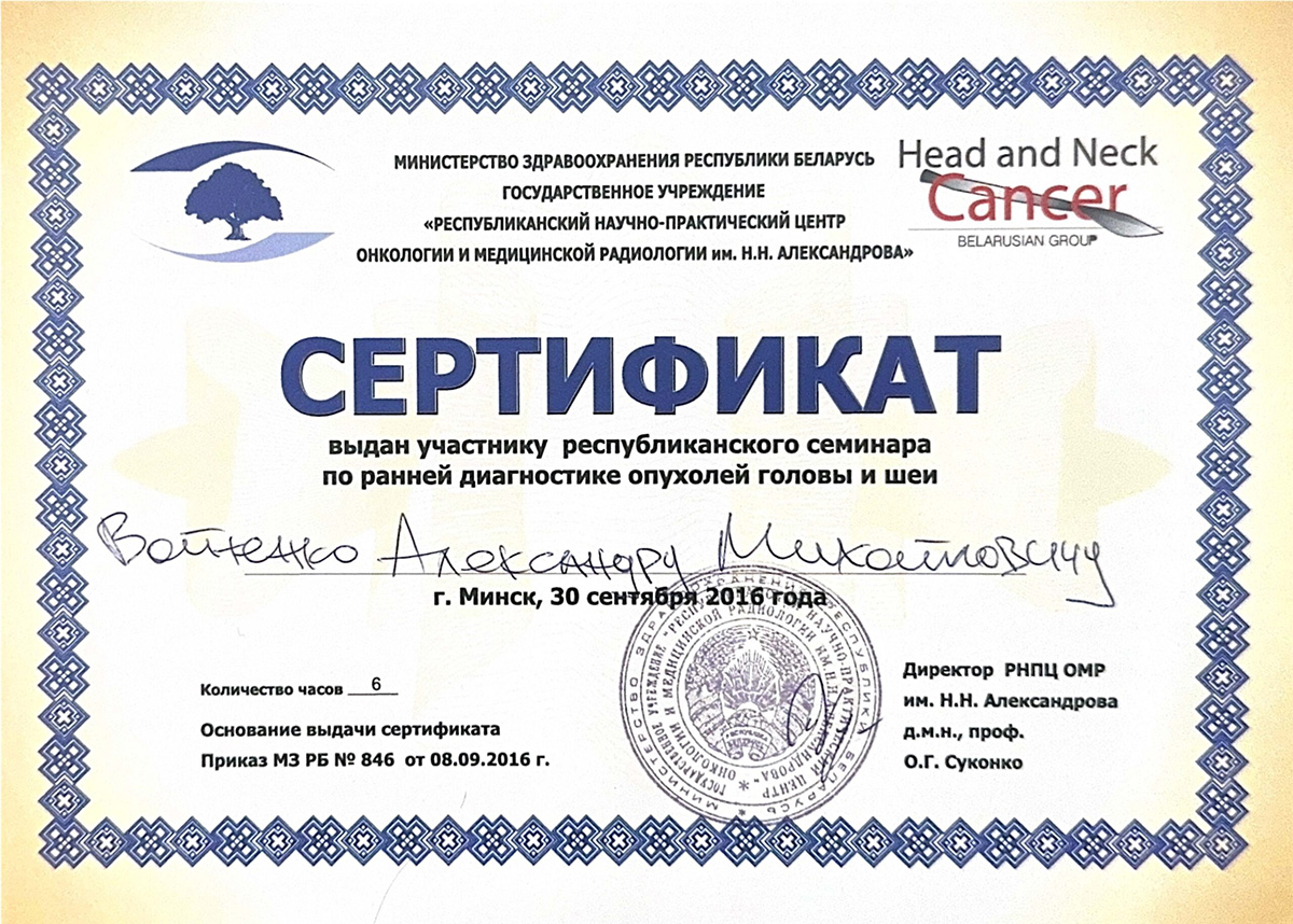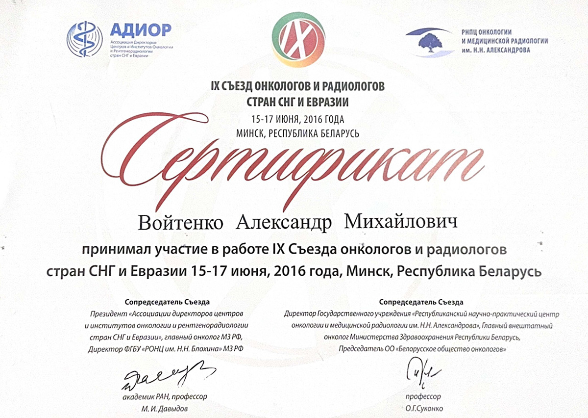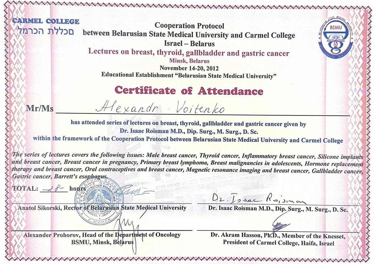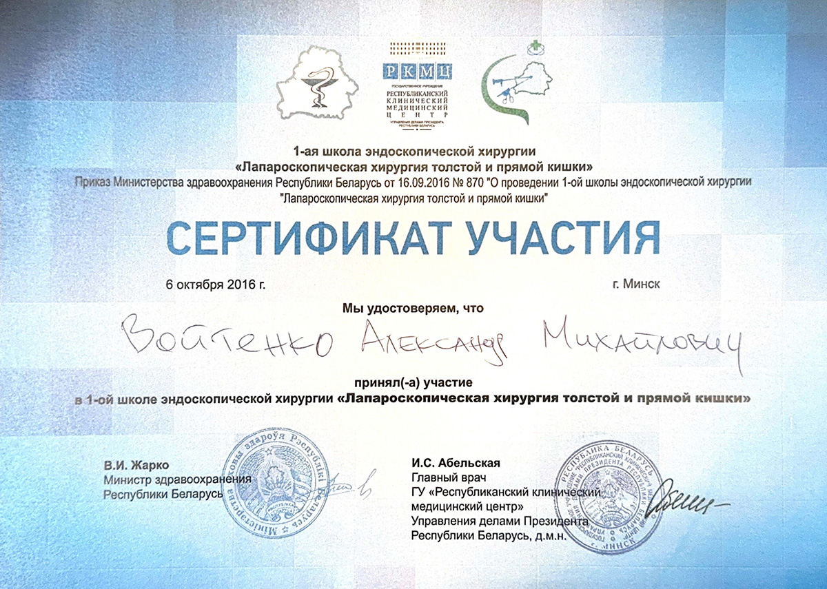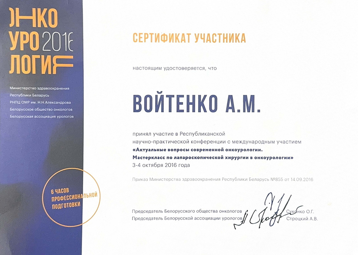 • 2016 г. — переподготовка по специальности «Онкохирургия» на кафедре онкологии БелМАПО (Минск, Беларусь).