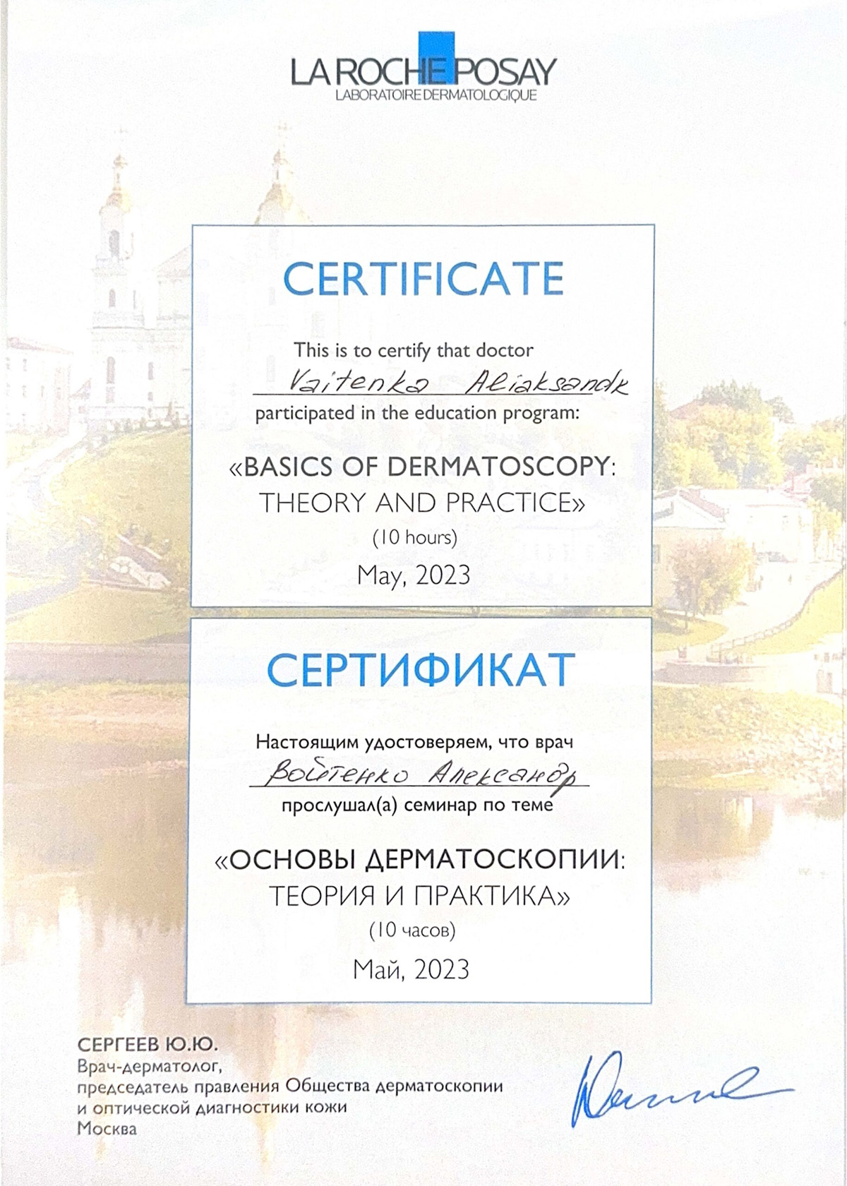 • 2017 г. — курсы повышения квалификации «Дифференциальная диагностика и лечение доброкачественных и злокачественных опухолей кожи».