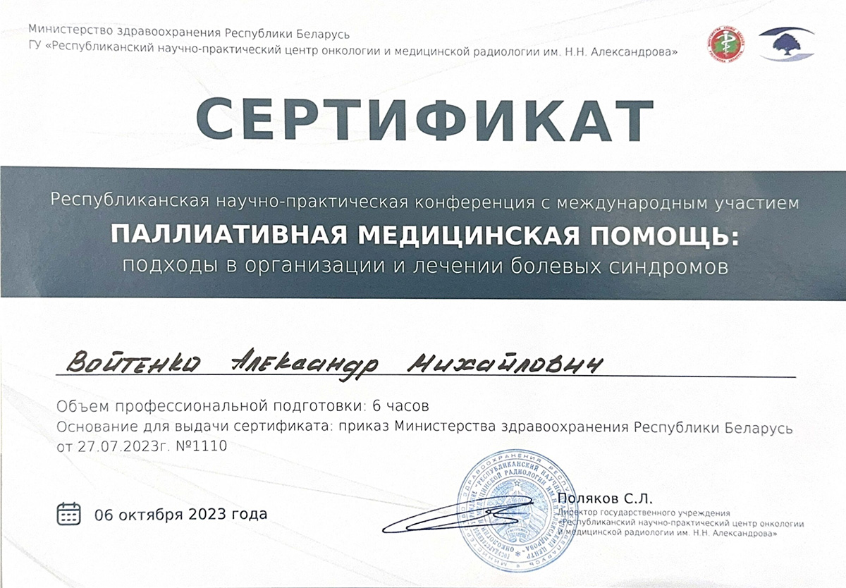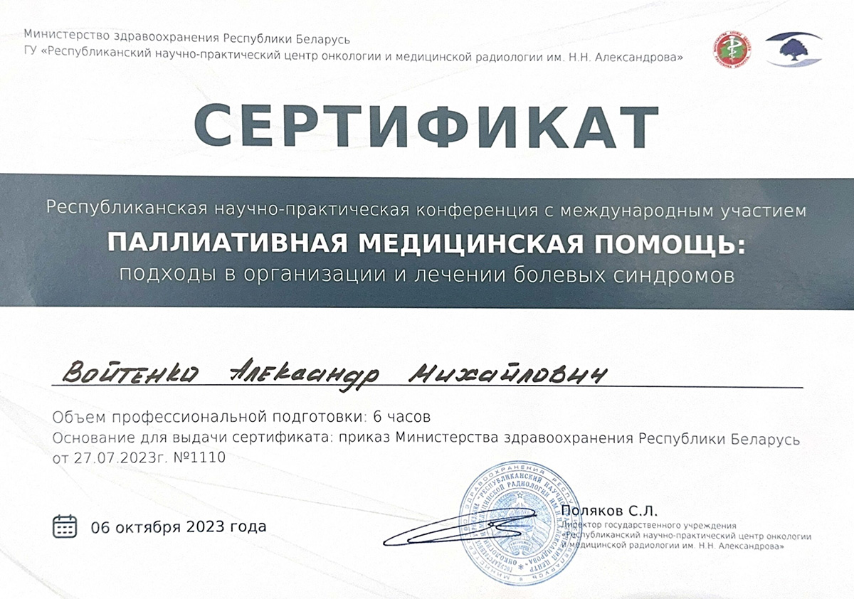 • 2021 г. — курсы повышения квалификации «Паллиативная медицинская помощь и основные принципы обезболивания пациентов».