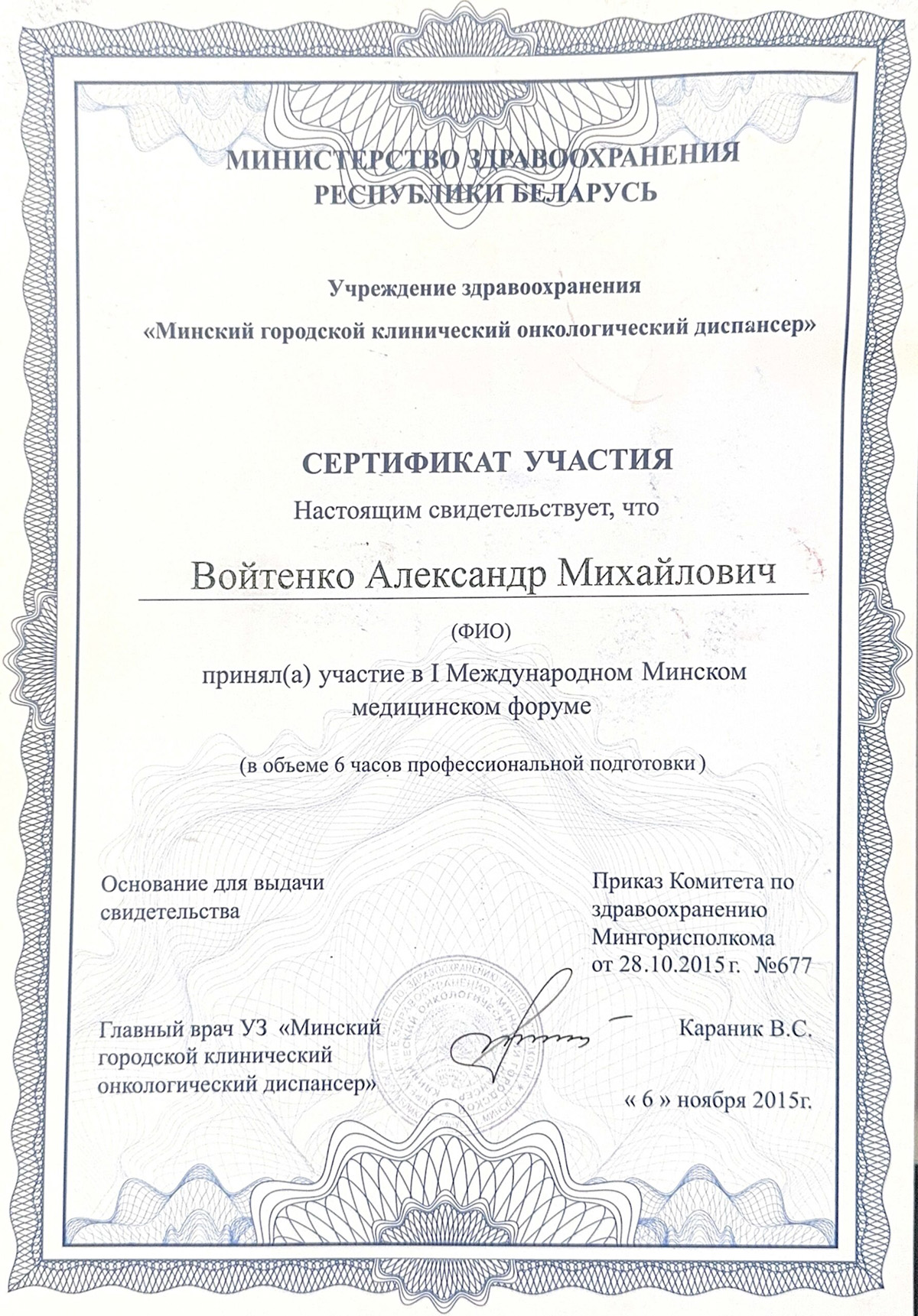 • 2012–2013 гг. — Интернатура по специальности «Онкология» на базе УЗ «Минский городской клинический онкологический центр».