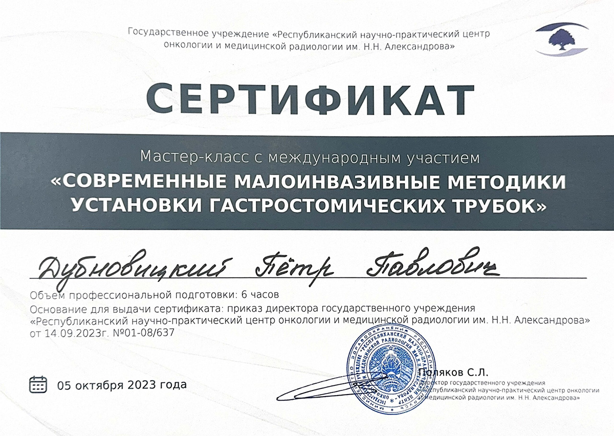 • 2010 г. — курсы повышения квалификации «Диагностика и лечение опухолей желудочно-кишечного тракта».