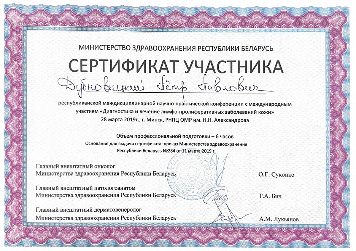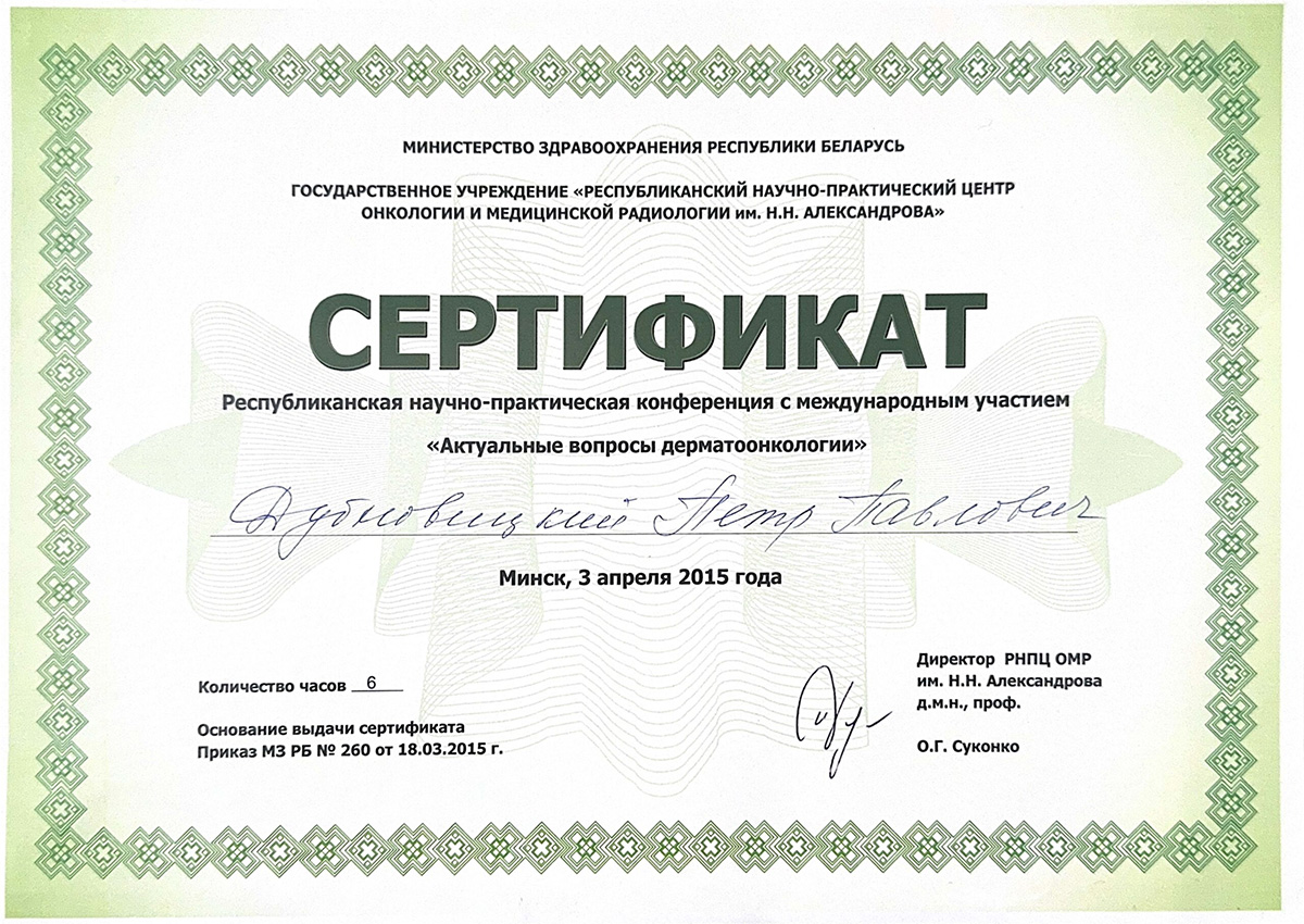 • 2020 г. — курсы повышения квалификации «Дерматоонкология».