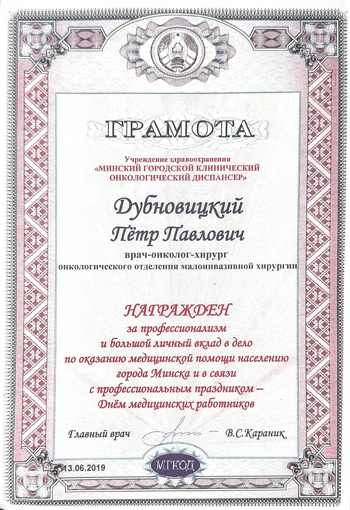 • 2019 г. — курсы повышения квалификации Биопсийная диагностика заболеваний мочевого пузыря и предстательной железы».