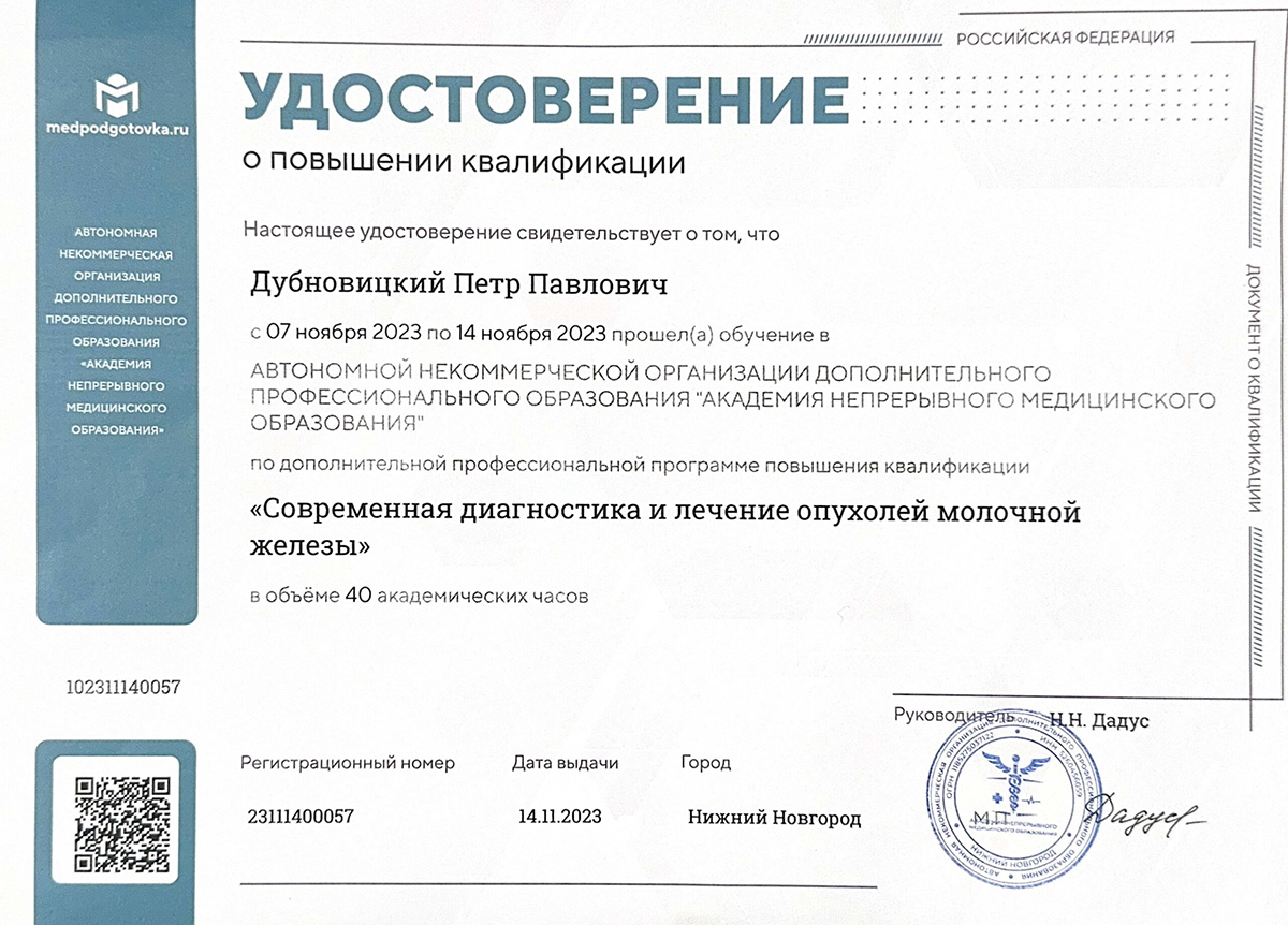 • 2023 г. — курсы повышения квалификации «Современная диагностика и лечение опухолей молочной железы».