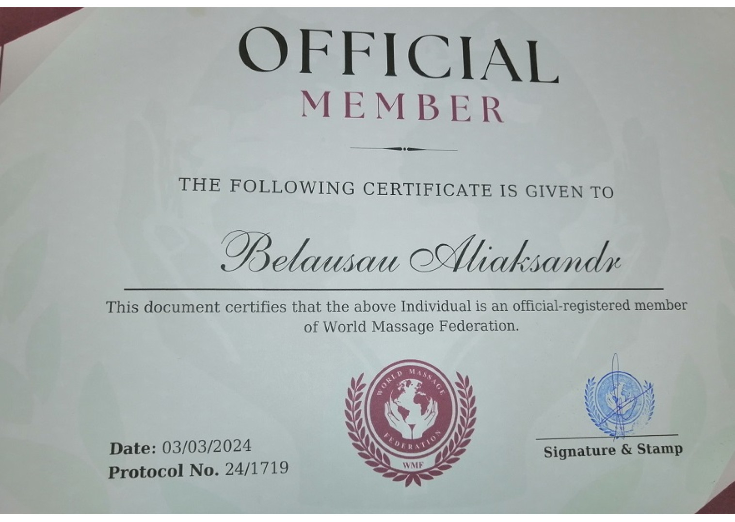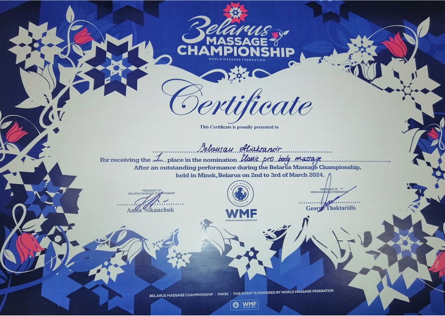 • 2024 г. — победитель BELARUS MASSAGE CHAMPIONSHIP, одно из престижных событий в мире массажа