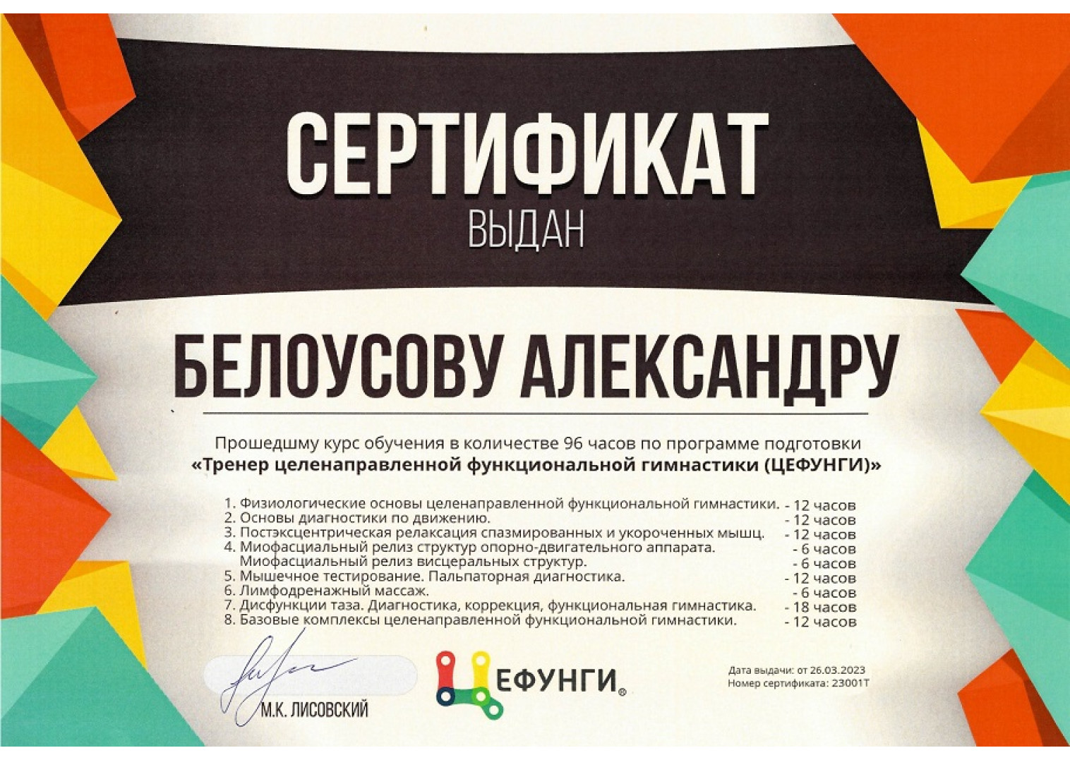 Специализируется на нейромышечной коррекции, биомеханике и кинезиологии.
